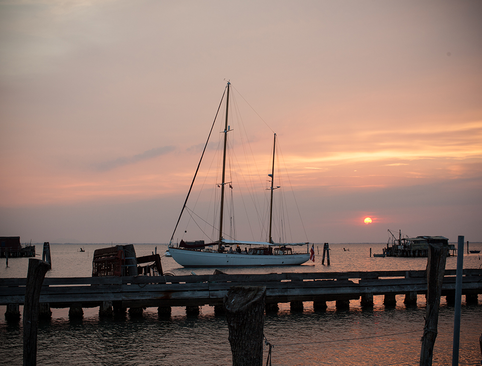 We sometimes anchor off here, either to barbecue on deck or to eat at one of the great restaurants – da Celeste in Pelestrina, or Da Nano in San Pietro in Volta are both excellent – each with unique views of the lagoon and its extraordinary fishing huts.