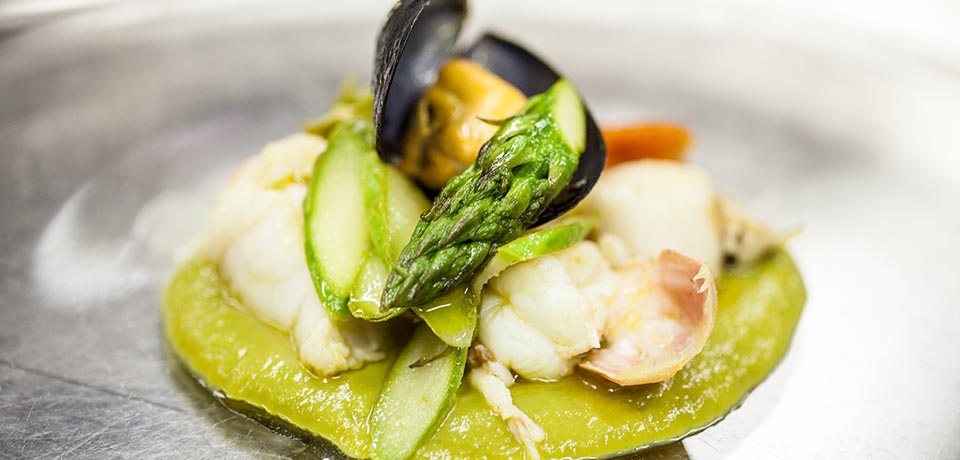 5. To serve, place a heaped tablespoon of the warmed puréed asparagus as a bed on the plate, then top with the monkfish, scampi and scallop, placing the finely chopped asparagus on top.