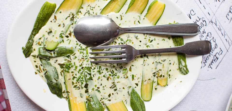 3. Season to taste and pour it over the courgettes slices, which you have arranged on individual plates