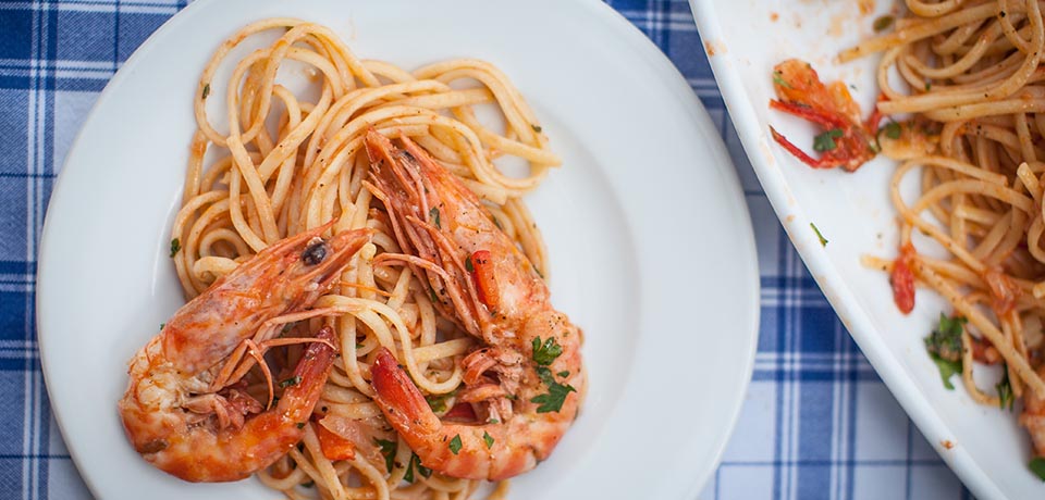 5. Take two ladles-full of the pasta water and add it to the sauce with the prawns. Then add the white wine and simmer on a low flame.