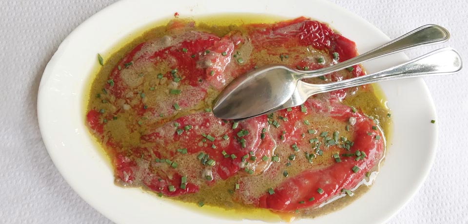 4, Arrange the red pepper segments on a serving dish and coat with the anchovy sauce.